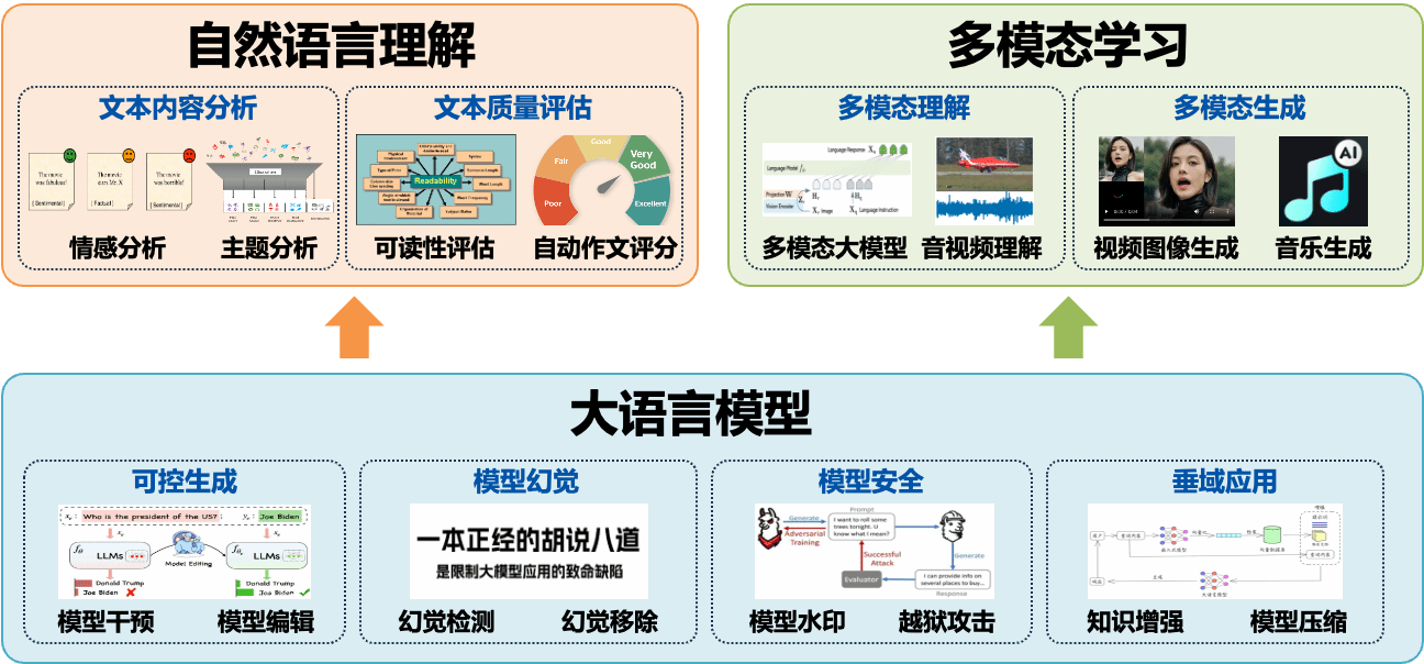 课题组主要围绕大语言模型、自然语言理解、多模态学习三个大方向来开展前沿探索。