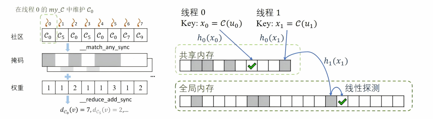 低效的中间状态管理:Louvain 算法需要一组更复杂的状态来追踪顶点与其邻近社区之间的权重。早期在 GPU 上的尝试使用全局内存来存储中间状态。这导致了严重的性能瓶颈,影响了整体性能。后续研究使用共享内存来维护小度数顶点的中间状态,但仍然没有充分利用 GPU 的内存层次结构。