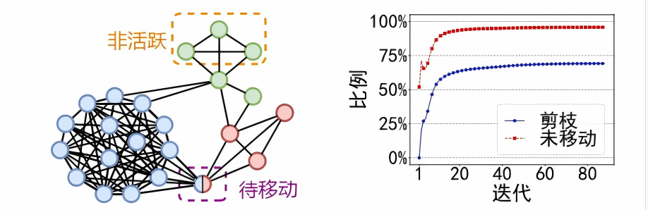 剪枝不准确或不足:在大规模图中,Louvain 算法可能需要大量迭代才能收敛,如图 2(b) 所示。随着迭代的进行,我们观察到很大一部分(高达 95%)的顶点仍保留在其当前社区中,即未移动的顶点。如果我们能够预测这些未移动的顶点并在迭代之前将其标记为非活动顶点,则有机会跳过这些处理。例如,图 2(a) 中橙色虚线包围的三个绿色顶点位于社区的核心,即它们的邻居都不属于其他社区,并且它们的邻居在上一次迭代中未移动。因此,这三个顶点可以标记为非活动顶点。我们观察到,现有的仅基于移动信息的启发式剪枝策略存在双重缺陷:它们要么导致次优解,要么无法充分识别未移动的顶点。幸运的是,Louvain 算法的并行实现所使用的批量同步并行 (BSP) 模型,除了单纯的顶点移动之外,还能提供更丰富的信息,从而能够开发高效的修剪策略。