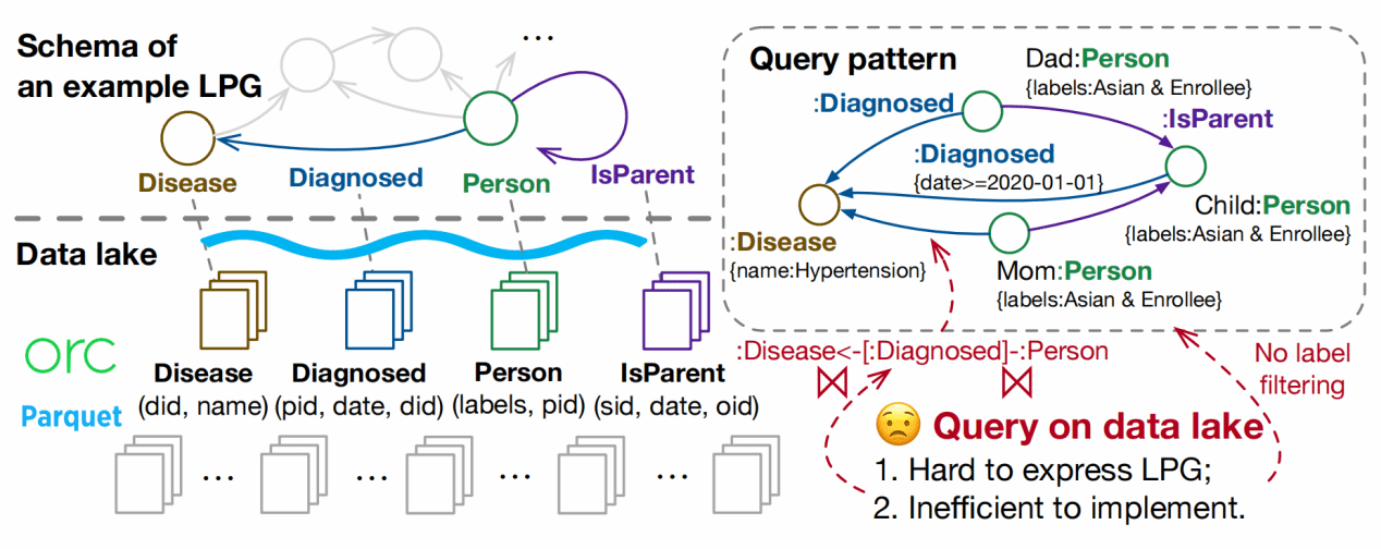 第三项工作聚焦于解决数据湖场景下图数据管理效率低下的挑战。数据湖虽能存储海量异构数据,但其通用的列式存储格式(如Parquet)并未对图数据结构进行优化,导致邻居节点查询、标签过滤等图分析核心操作效率低下。为此,研究团队设计并研发了GraphAr:一种面向数据湖的高效图数据存储方案(发表于PVLDB)。GraphAr巧妙地构建于现有Parquet格式之上,通过标准化的YAML元数据文件与精心设计的数据布局(如CSR/CSC压缩稀疏行/列格式),完整地表达了工业界广泛应用的标签属性图(LPG)模型。更重要的是,它针对图操作进行了深度优化,设计了页对齐集合(PAC)数据结构,并结合现代CPU的位操作指令集(BMI)与单指令多数据流(SIMD)技术,开发了创新的编解码算法。这些优化使得邻居查询和标签过滤等操作的性能得到极致提升。评测结果显示,GraphAr的邻居查询速度比传统方法平均提升4452倍,端到端图分析负载性能提升29.5倍。该工作使得在数据湖上直接进行高性能图分析成为可能,极大地拓展了数据湖的应用边界。