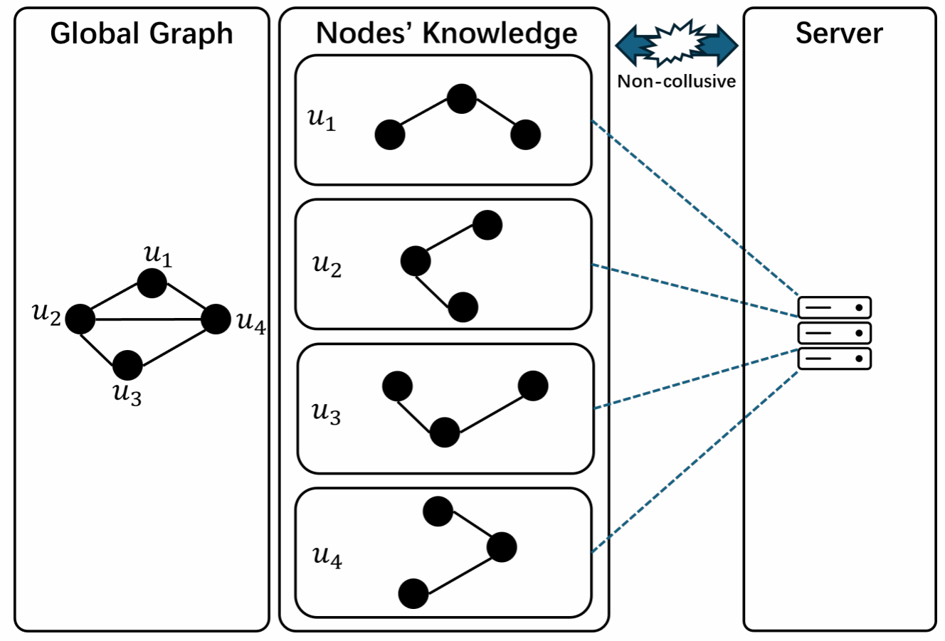 第二项工作致力于解决图数据分析中的隐私保护问题。图分析(如社交网络中的“三角关系”挖掘)应用价值巨大,但往往涉及用户连接关系等敏感信息。现有的差分隐私(DP)技术方案面临两难困境:中心化模型(CDP)虽然结果准确,但依赖一个完全可信的服务器,在去中心化场景中难以实现;而去中心化模型(LDP)虽无需可信方,却因注入过多噪声而导致结果准确性不佳。针对此,研究团队提出了Sectric:一个兼顾准确性、隐私性和效率的三角关系计数协议(发表于PVLDB)。Sectric开创性地采用密码学辅助方案,设计了全新的“三方私有集合成员测试”(3PPSMT)密码学原语,并用节点邻居集合代替传统的邻接向量进行计算。这一设计在不依赖任何可信第三方的前提下,达到了与中心化模型同等的计算准确度和隐私保护水平,同时将计算开销从O(|V|^2)级别显著降低至O(d_max |V|)级别,尤其适用于大规模稀疏图。该工作成功弥合了现有隐私保护图计算方案在信任假设和计算效用之间的鸿沟,为去中心化环境下的隐私安全数据分析提供了理论创新与实用技术。