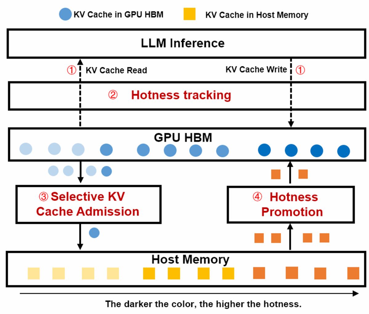 第一项工作关注大模型推理系统中的关键性能瓶颈——KV Cache管理。随着大语言模型(LLM)的广泛应用,诸如长提示(long-prompt)和检索增强生成(RAG)等技术场景日益普遍。这些场景中,大量共享前缀(如系统指令、检索文档)会导致KV Cache的冗余存储和重复计算,严重占用宝贵的GPU显存资源,限制了推理系统的吞吐量和并发能力。为此,研究团队提出了一个名为HotPrefix的高效KV Cache管理与调度机制(被SIGMOD 2026录用)。该机制创新性地设计了“热度感知布谷鸟过滤器”,能够以极低的开销动态追踪不同前缀KV Cache的访问热度。基于精确的热度感知,HotPrefix实现了GPU与CPU内存之间高效的协同调度,通过“选择性准入”策略将高热度缓存数据卸载至CPU,并利用“高效预取”机制在需要时将其提前加载回GPU。实验证明,该方法能显著提升KV Cache的GPU命中率,与vLLM等现有先进系统相比,最高可将长提示场景下的端到端推理性能(时延与吞吐量)提升2.25倍,为解决大模型落地应用中的性能难题提供了关键方案。